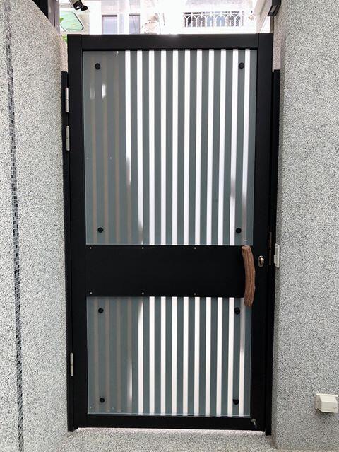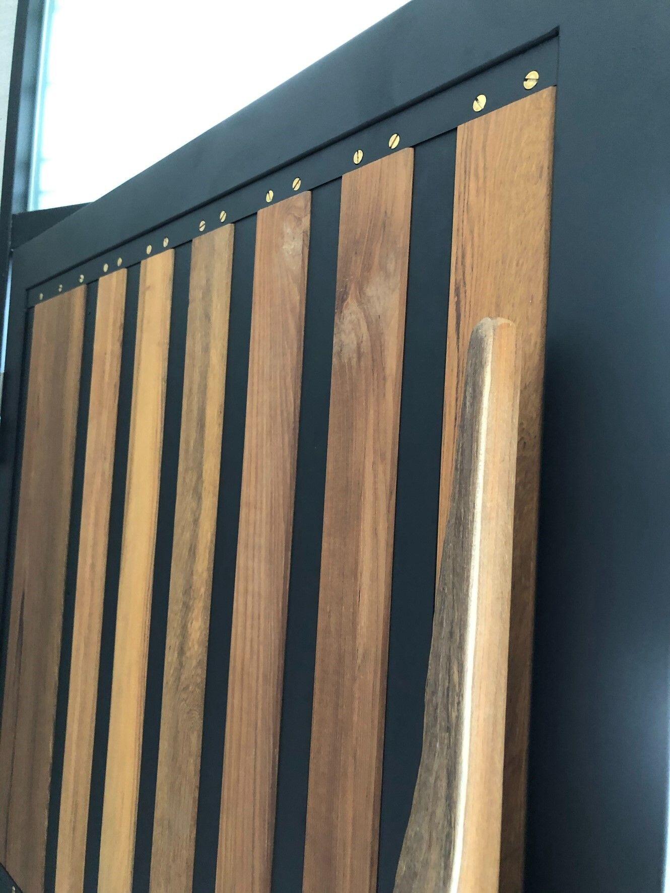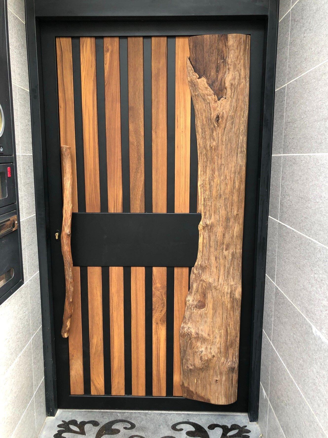 鐵件的規格樣式都可以依造使用環境來訂制,不用擔心淋雨跟日曬問題,不銹鋼跟緬甸柚木都是很適合在戶外使用的。 第一組客人住在海邊附近,採用緬甸柚木木料跟銅螺絲,整隻的緬甸柚木邊料,帶有點自然風化邊,突顯整張門特色,肖楠把手作為完美結合